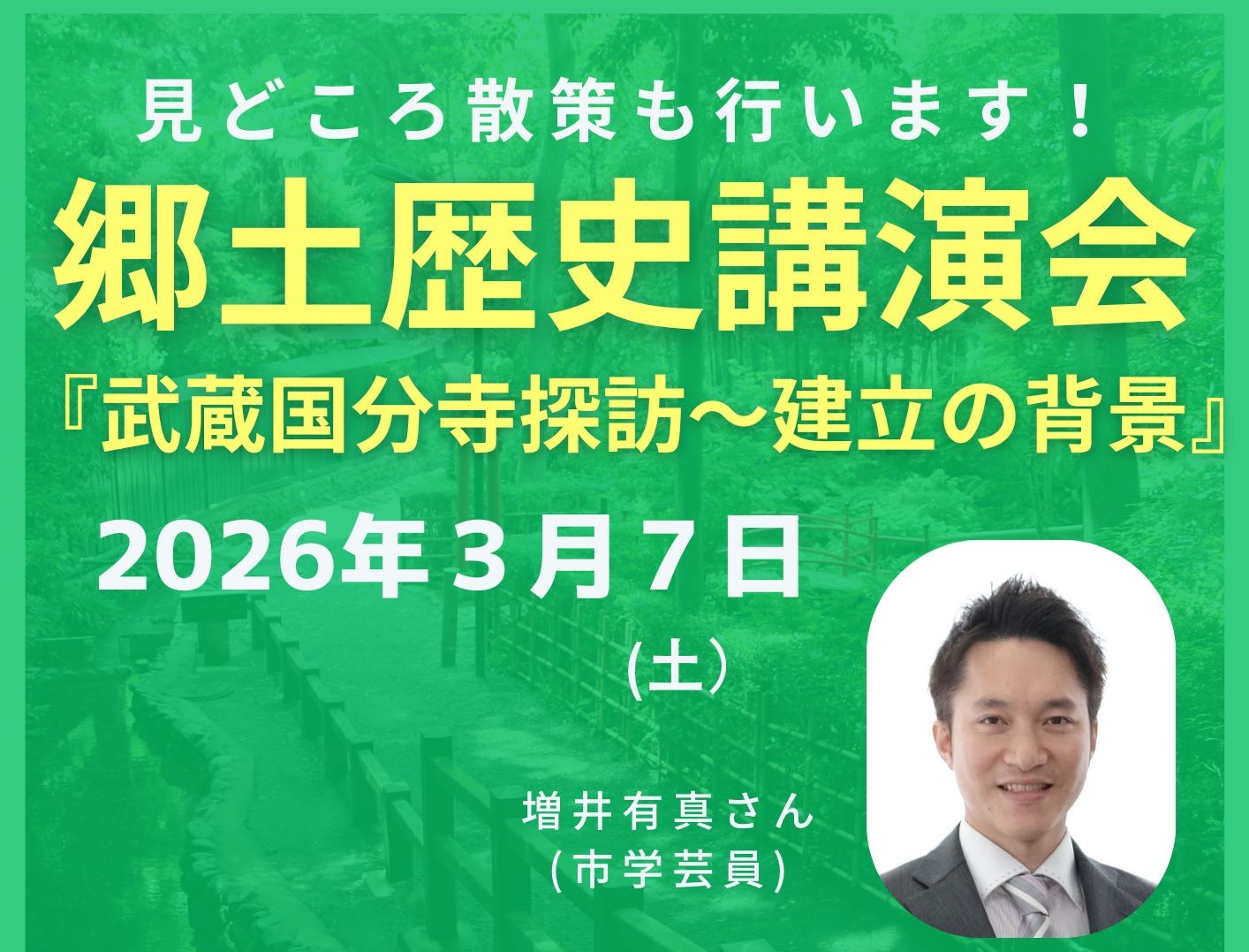 「武蔵国分寺探訪~建立の背景」をテーマに、市学芸員の増井有真さんに講演します。